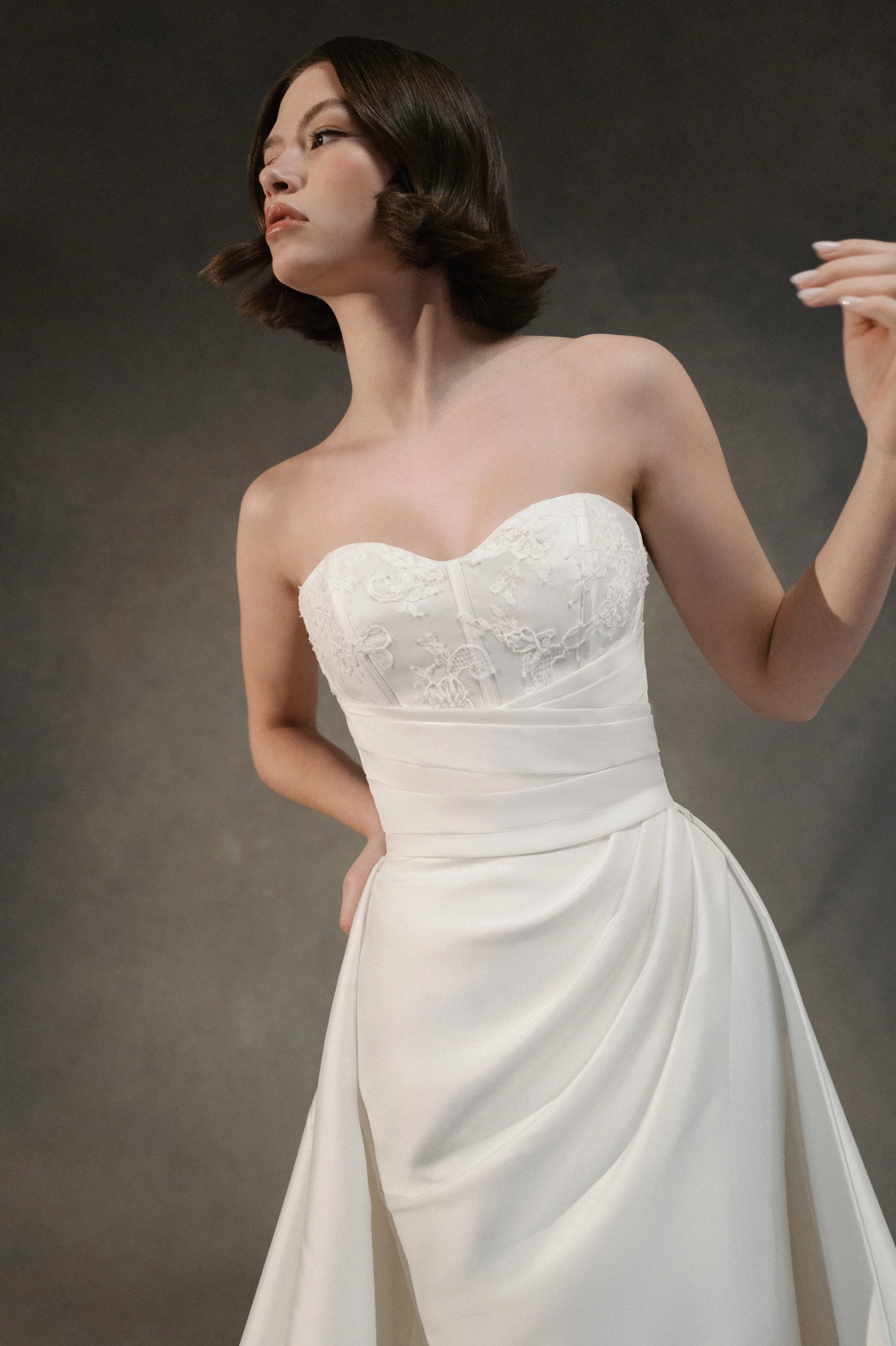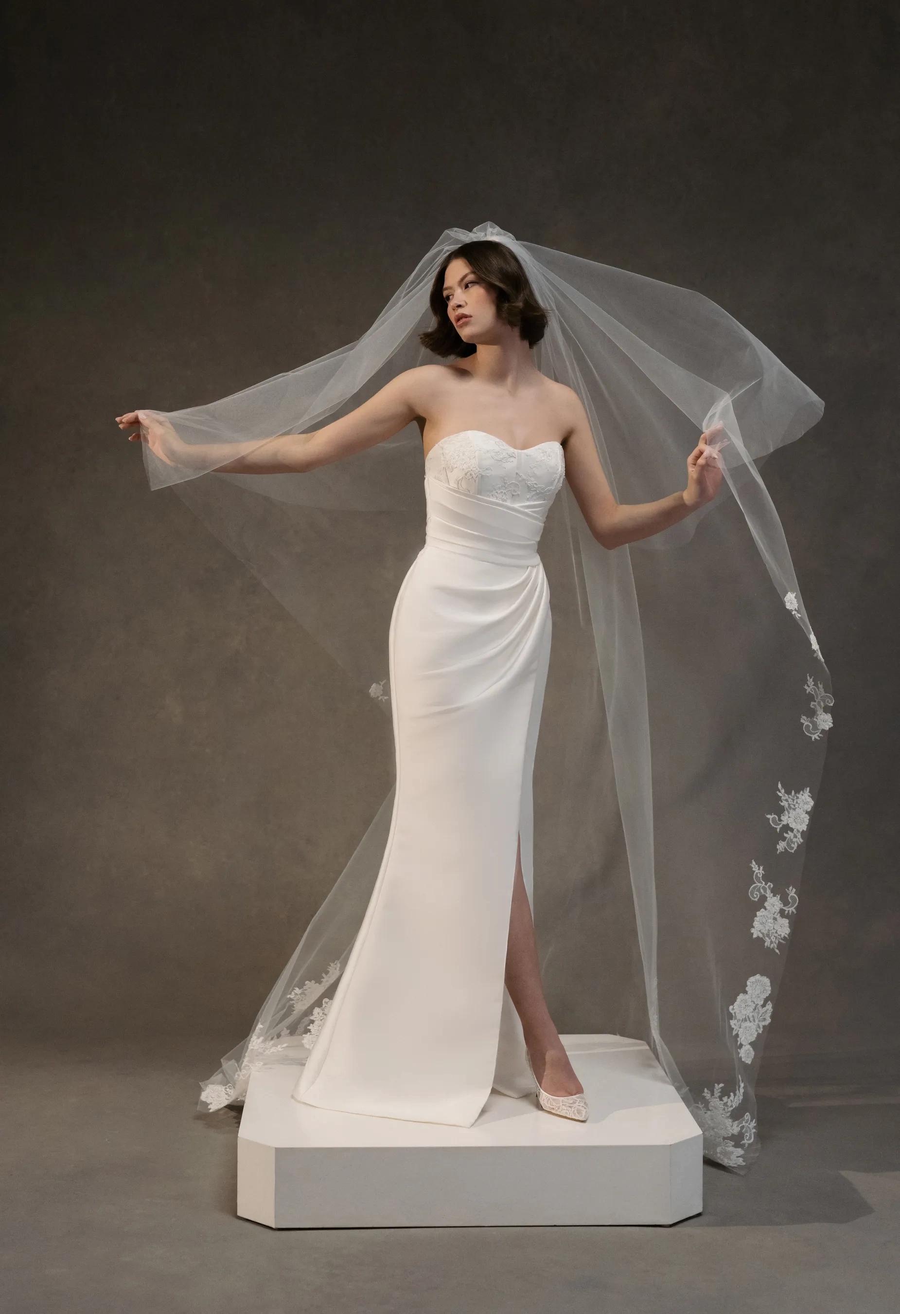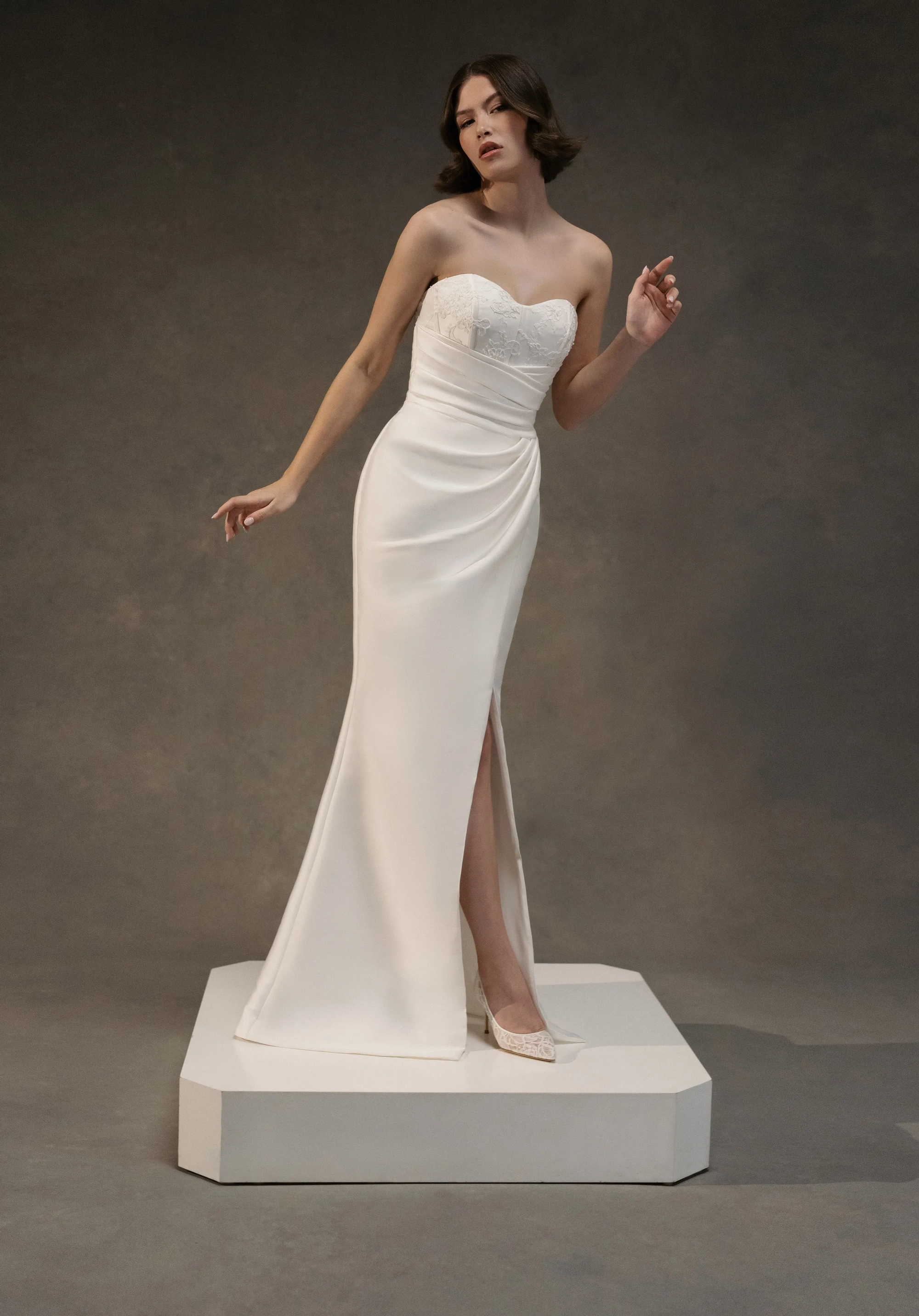Please note that we are currently showcasing the full collections from our designers. Not all gowns are readily available in-store. To find out more about our in-store inventory, please contact our Chicago Store or our Oakbrook Store.